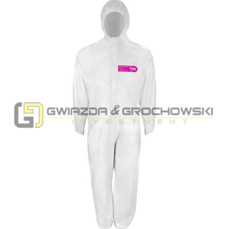 Kombinezon chroniący przed chemikaliami, wykonany z materiału: włóknina przędzona PP z mikroporowatym laminatem f ilmowym.